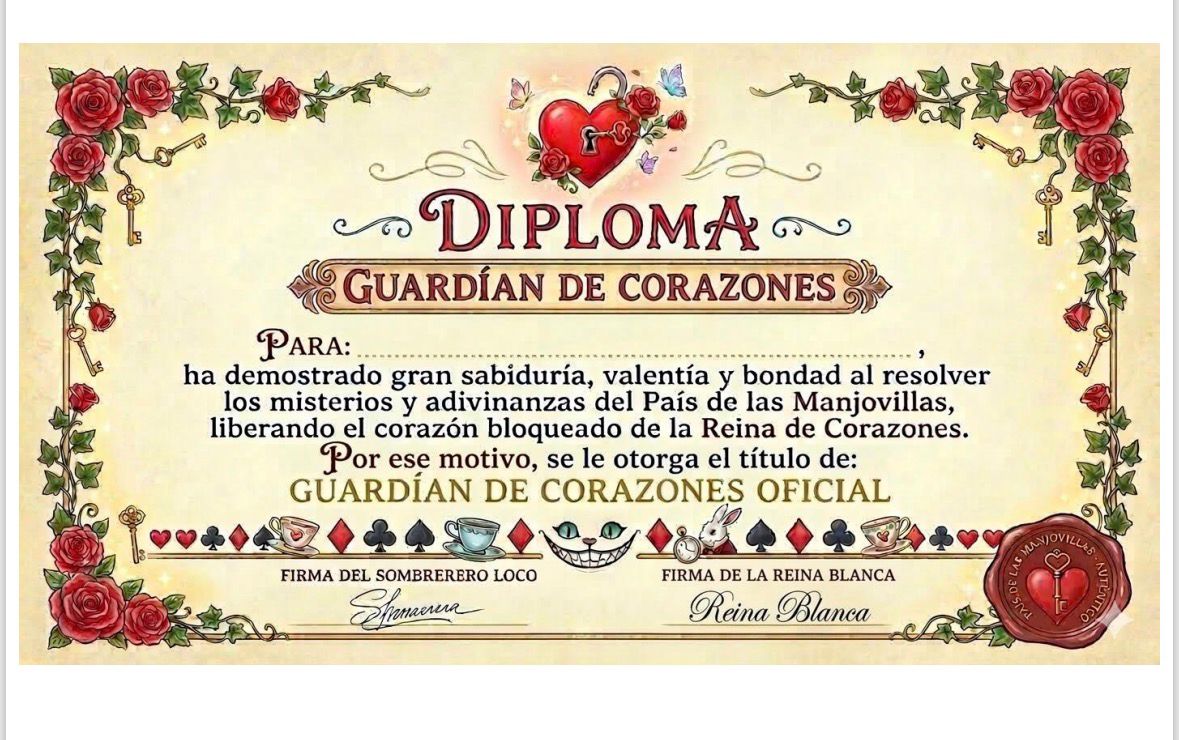 Los niños se sentaron a su alrededor esperando las indicaciones del Sombrerero. La Reina parecía no haberles visto… hasta que el Sombrerero comenzó a rodearla formando un círculo con las teteras 🫖 e invitó a todos a hacer lo mismo. Poco a poco, los aventureros comenzaron a decirle palabras bonitas 💛 y la Reina fue levantando la cabeza. Con gesto de dolor, llevó su mano al corazón y sacó un pequeño cofre que dejó frente a ellos. El Sombrerero pidió silencio y, utilizando las Gemas de la Verdad, realizó un pequeño conjuro sobre la llave ✨. Gracias al trabajo en equipo y la dulzura acumulada, consiguieron abrir el cofre. “¡No hay maldad!” exclamó el Sombrerero al descubrir en su interior un antiguo mapa de Manjovillas junto a un mensaje: “se agota el tiempo” 🗺️ Con tristeza, la Reina confesó: El Sombrerero preguntó entonces a los aventureros si querían ayudarla. Ellos respondieron que sí: si la Reina prometía ser más amable, ellos se comprometerían a colorear y salvar Manjovillas junto a ella 🌹🎨 La Reina, emocionada, preguntó: “¿De verdad?” Y el Sombrerero concluyó: